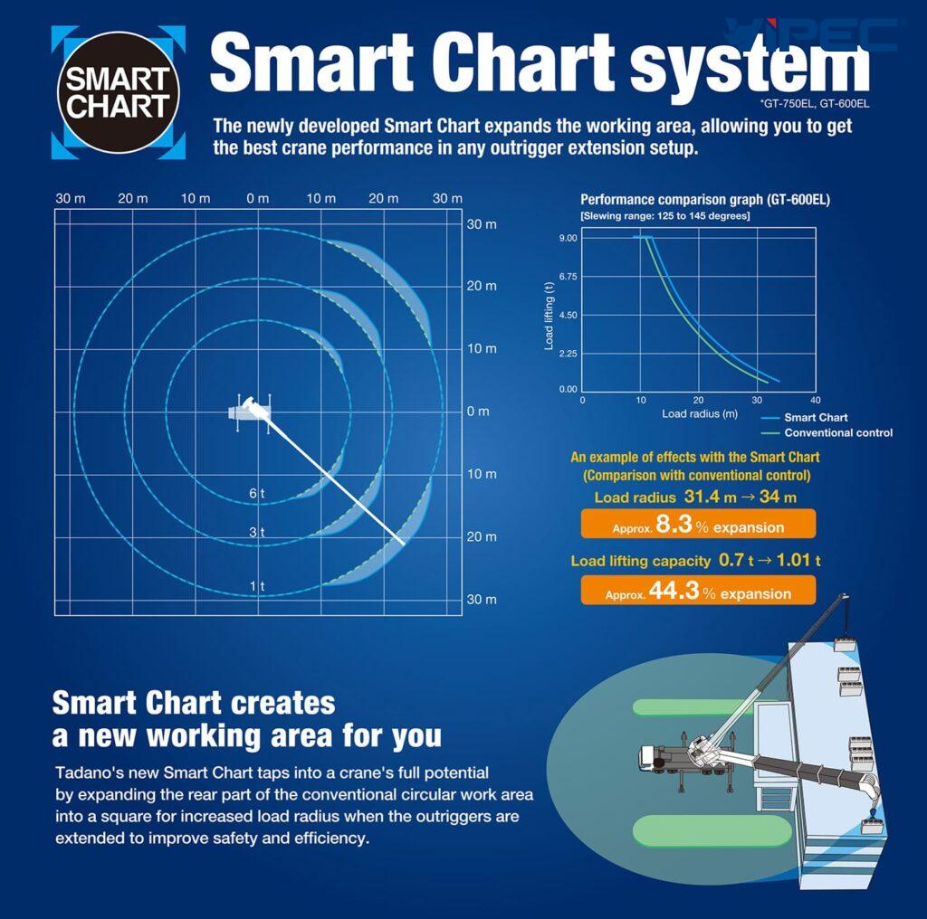 Công nghệ này sau đó đã phát triển thành Smart Chart – một hệ thống tiên tiến giúp nâng cao hiệu suất cẩu, ngay cả khi chân chống được mở rộng hoàn toàn. Smart Chart mở rộng phạm vi làm việc từ hình nón tròn sang hình chóp vuông, giúp tối ưu hóa hiệu suất cẩu trong mọi thiết lập mở rộng chân chống.