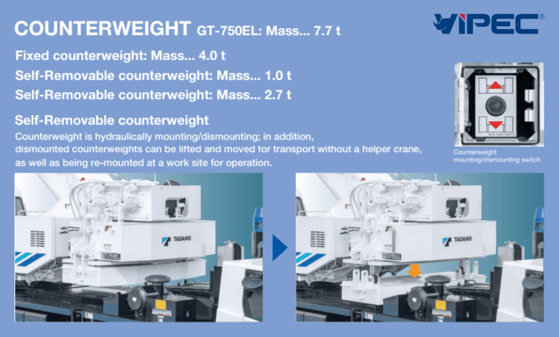 Đối trọng có thể được lắp đặt hoặc tháo dỡ bằng hệ thống thủy lực thông qua điều khiển từ xa mà không cần đến cần cẩu hỗ trợ.