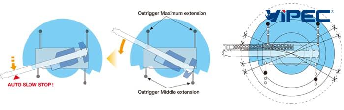 Khi vận hành cẩu với chân chống mở không đối xứng, hệ thống AML-C tự động phát hiện chiều rộng mở của chân chống ở phía trước và phía sau, cũng như bên trái và bên phải của cẩu, để tối ưu hóa giá trị công việc ở mỗi khu vực.