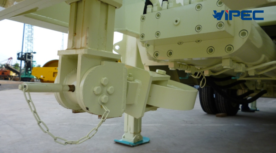 4 chân chống thuỷ lực, 1 chân chống phụ phía trước có bánh hỗ trợ chiều cao hoạt động một cách an toàn, hiệu quả thích ứng đa địa hình