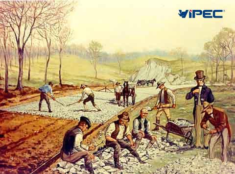 Cùng thời, John Loudon McAdam giới thiệu phương pháp trải đá nhỏ và ép kết chúng tạo thành bề mặt cứng.